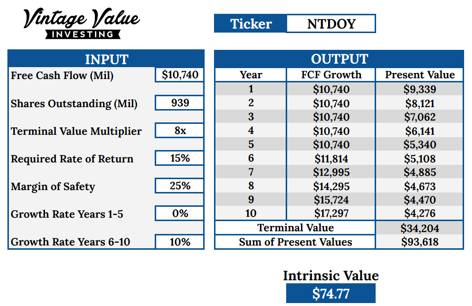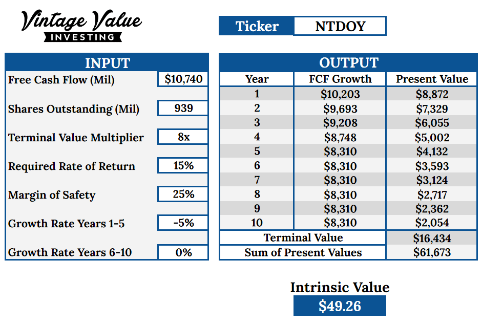 For the farther future, I assume something will work out to generate some growth, either a successful new console, theme parks, retail stores, movies, or augmented reality. I think any of these could produce a moderate 10% at least growth in cash flow.
