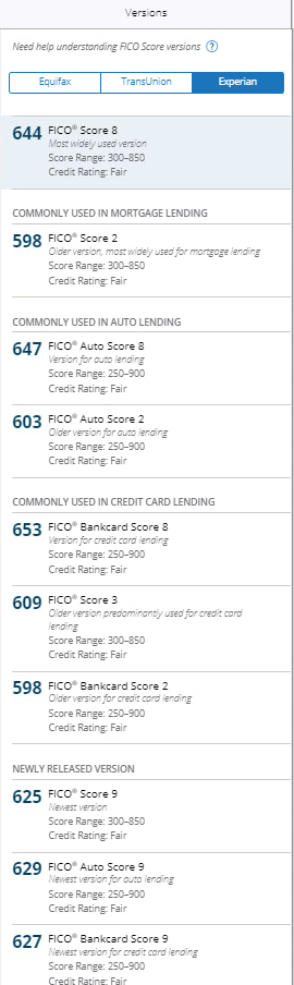 | Newly released version | FICO® Score 9 FICO® Auto Score 9 FICO® Bankcard Score 9 | FICO® Score 9 FICO® Auto Score 9 FICO® Bankcard Score 9 | FICO® Score 9 FICO® Auto Score 9 FICO® Bankcard Score 9 |